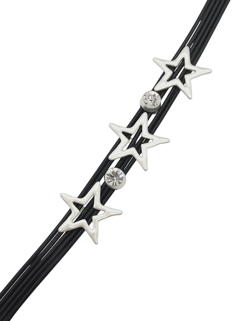 Schwarzes Lederarmband mit mattsilberfarbenen Sternen und weißen Zirkoniasteinchen.