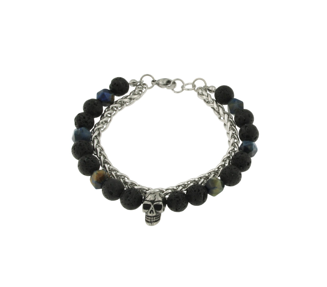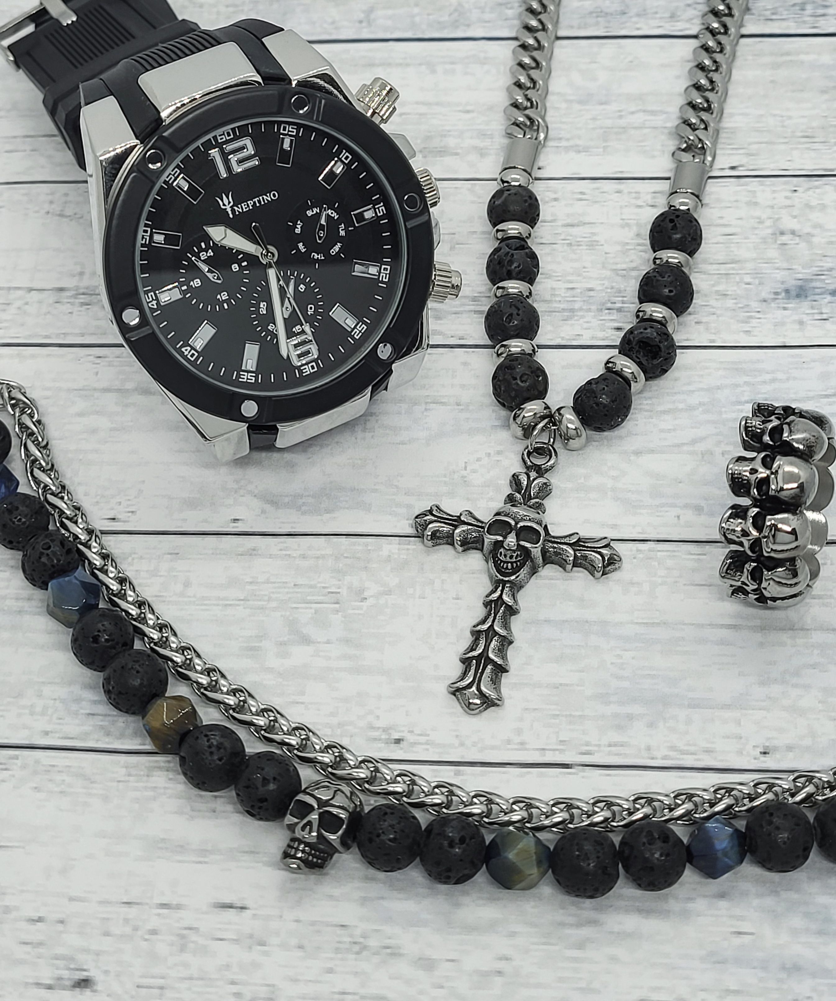 Modernes, Schmuckset mit rebellischem Touch. Enthält Uhr, Kette, Armband und Ring aus Edelstahl, ergänzt durch Lavastein-Elemente und Totenkopf-Details.