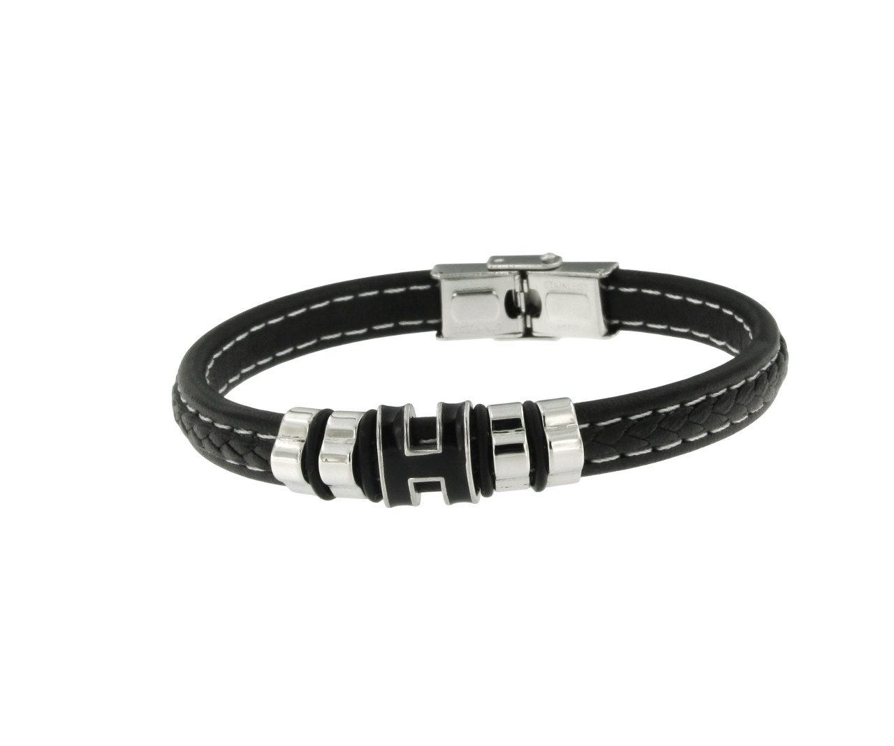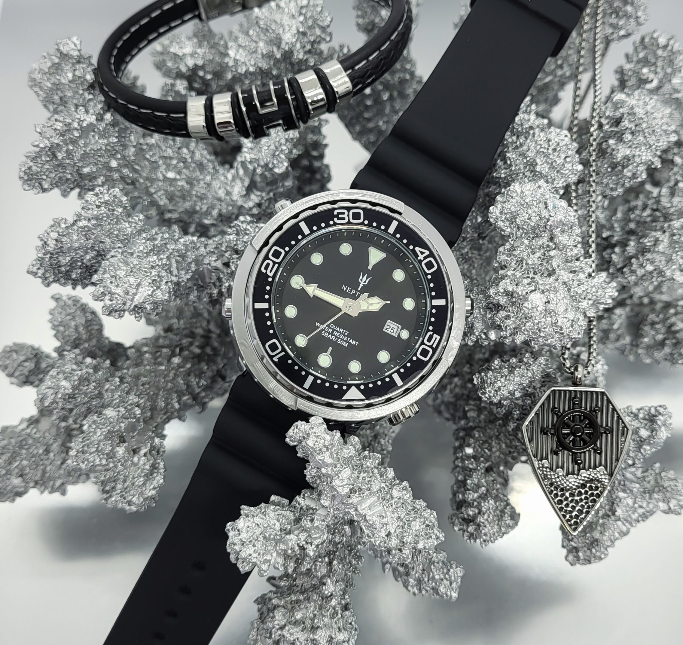 Modernes, maritim inspiriertes Set mit klaren Linien. Die schwarze Uhr ergänzt das Lederarmband und die maritime Kette für einen schönen Look.