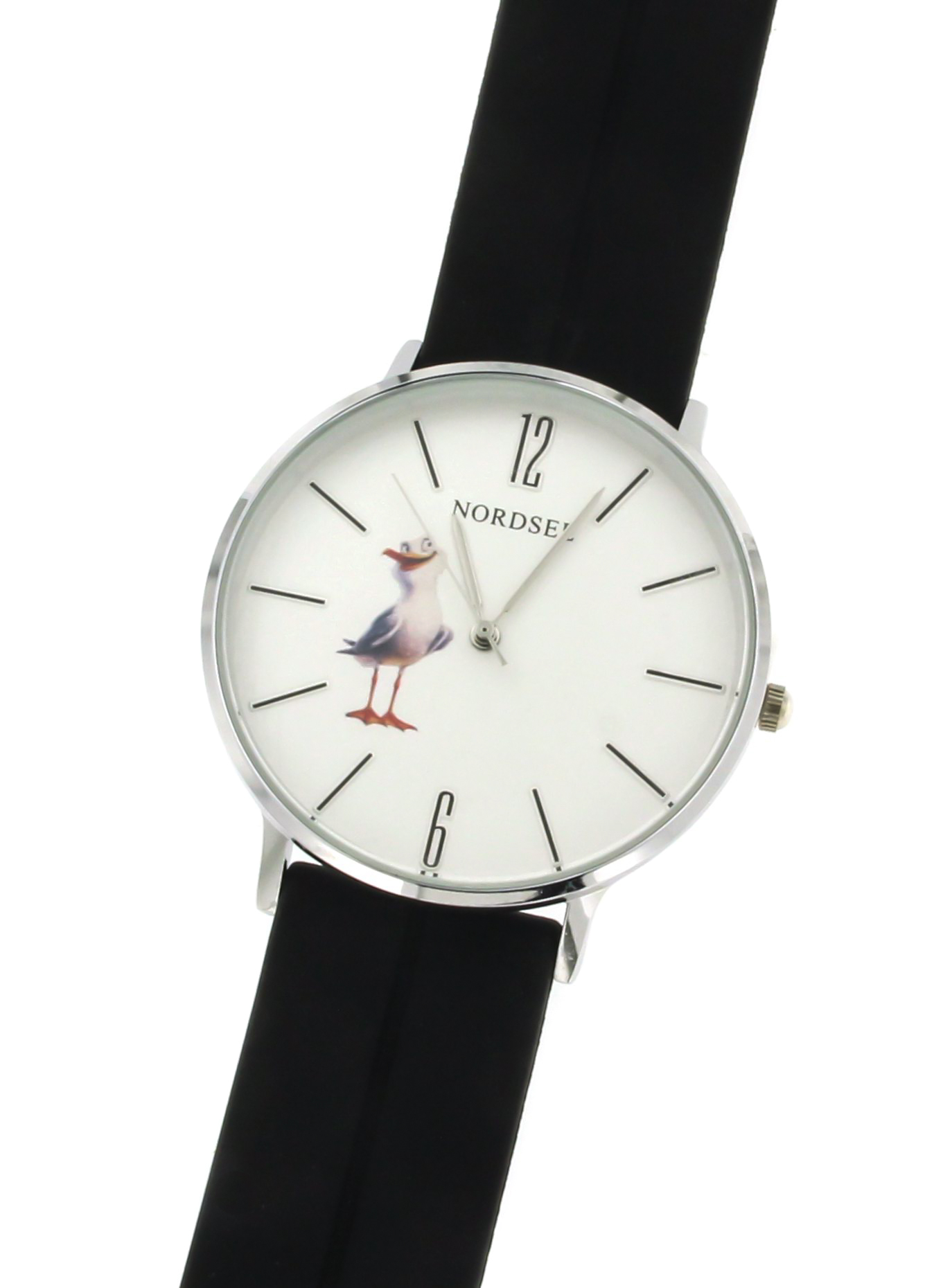 Diese charmante Nordseebäderuhr bringt sofort Urlaubsstimmung ans Handgelenk. Im Mittelpunkt steht eine lächelnde Möwe, die fröhlich vom Zifferblatt grüßt und das unbeschwerte Lebensgefühl der Nordsee einfängt. .