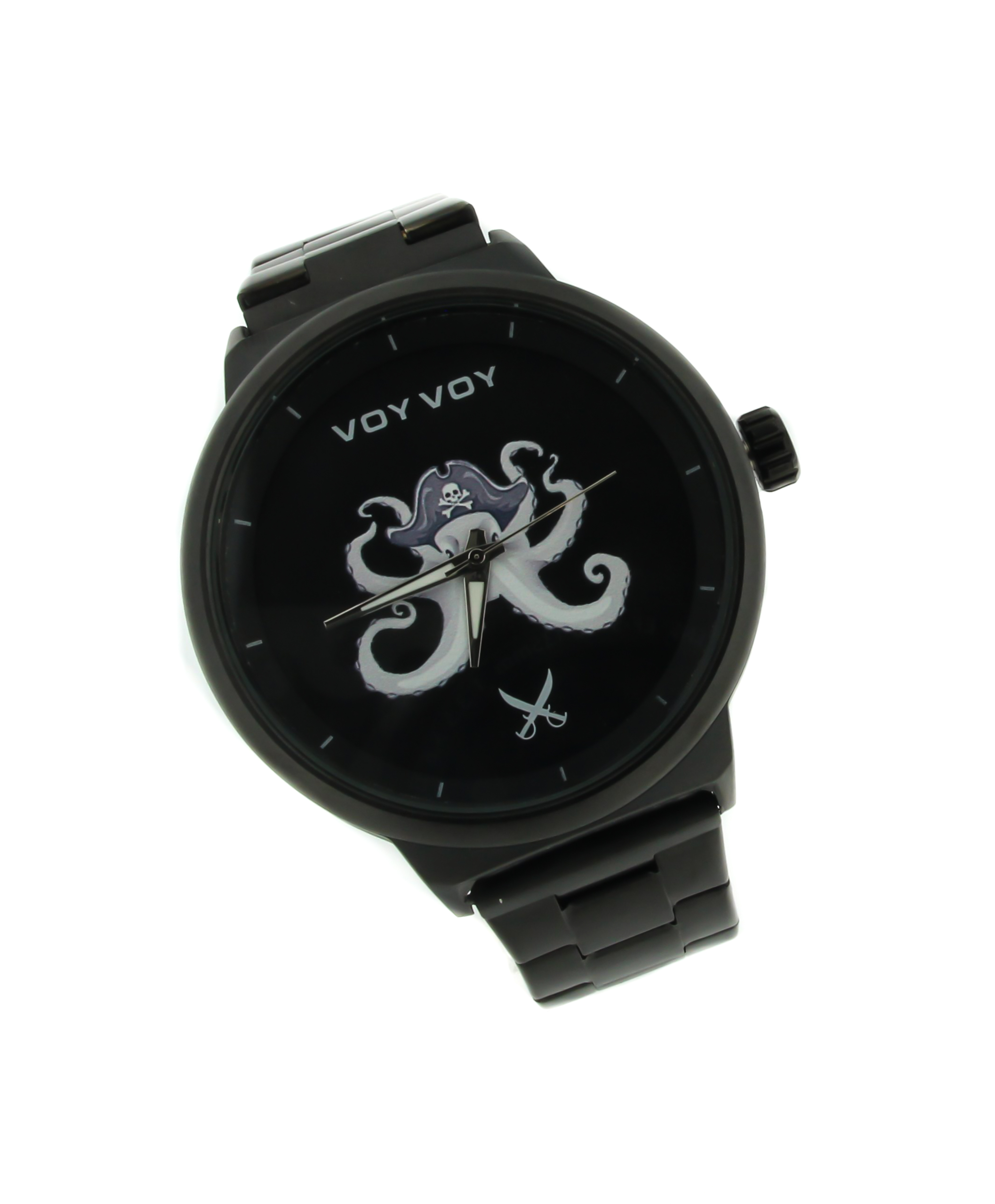 Metalluhr in mattschwarz, die durch ihre klare, kraftvolle Ästhetik sofort ins Auge fällt. Sie modern, minimalistisch und zugleich maskulin. Der Schriftzug VOY VOY, ein Octopus sowie Säbel über Kreuz zieren das Modell.